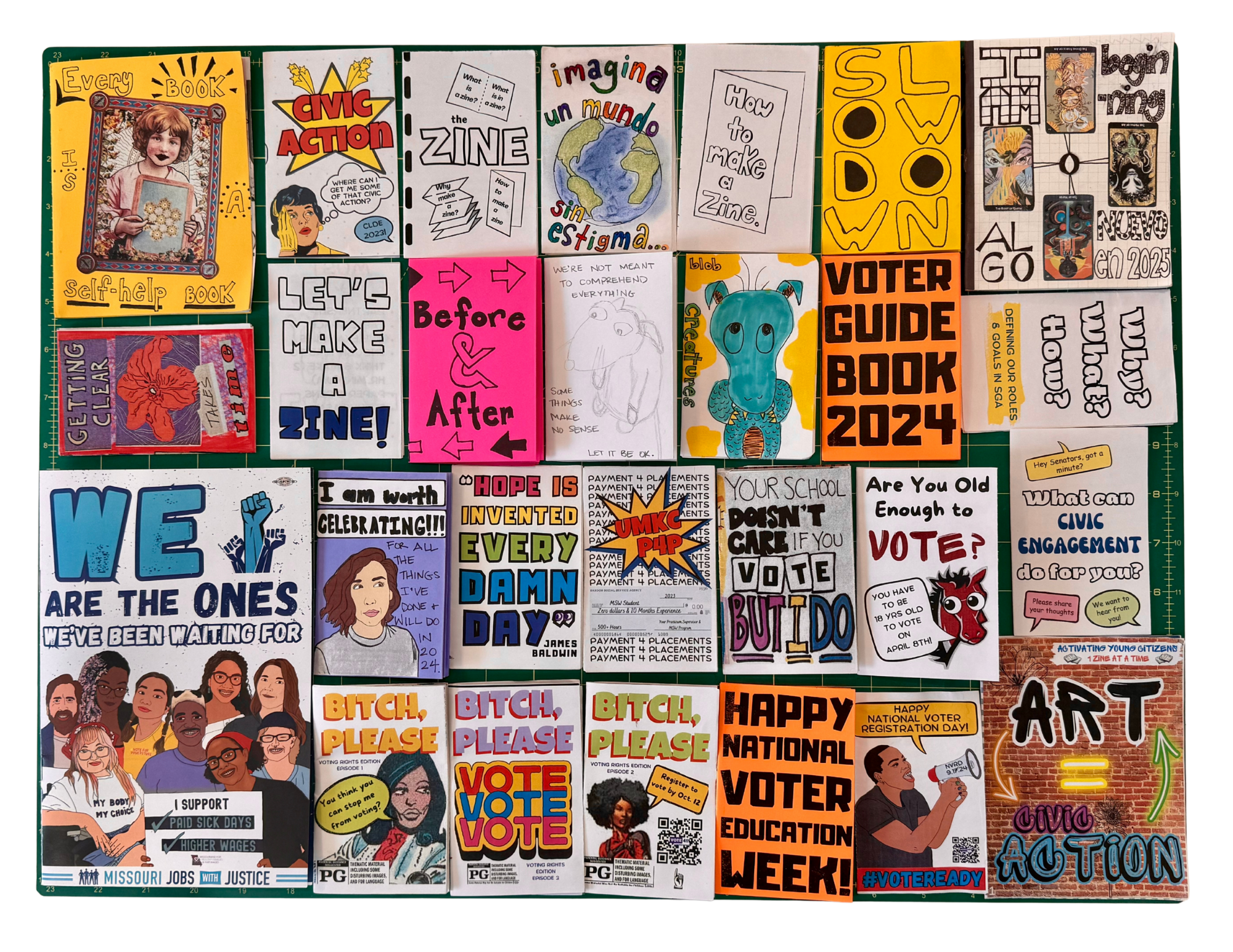 I made my first zine (a 3-part-mini-zine series) in 2022 aiming to raise awareness on my college campus about a voter suppression omnibus bill that passed in MO removing the right of college students to use their campus ID as voter ID. I was disappointed that the university made no effort to inform student voters of this issue prior to an important primary election.